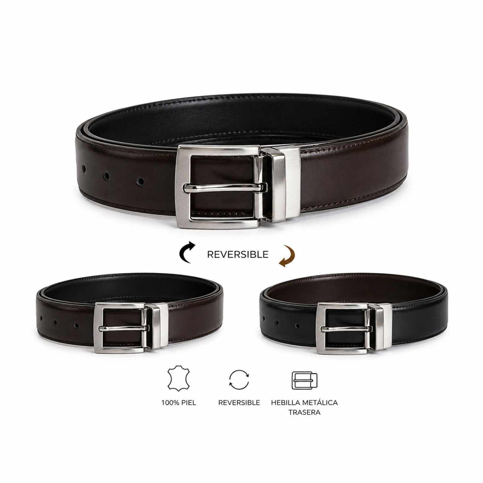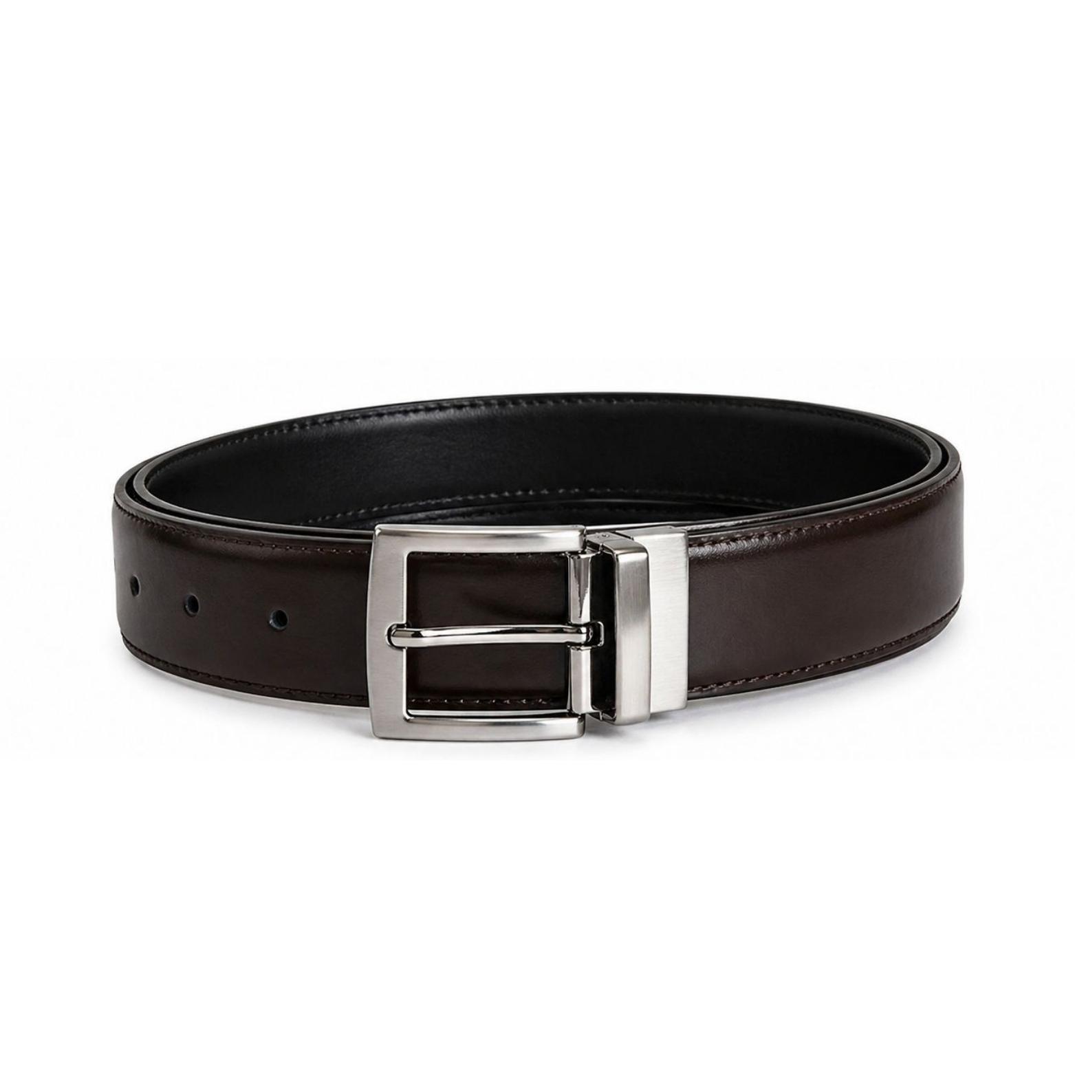 Cinturón de piel reversible marrón/negro con hebilla metálica