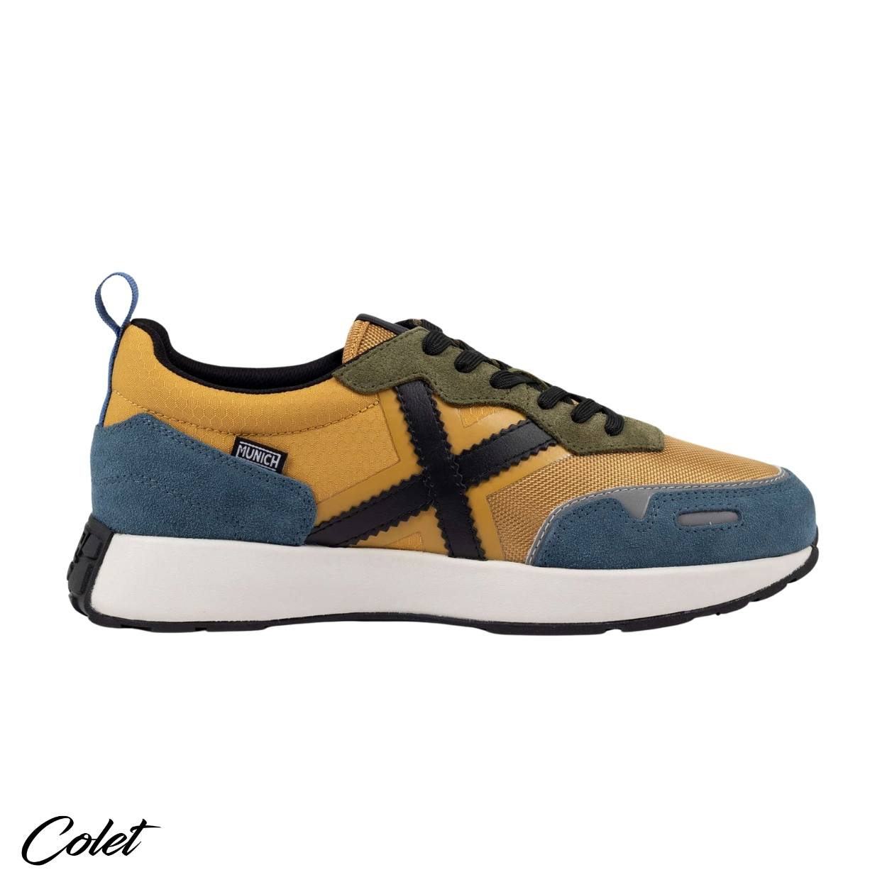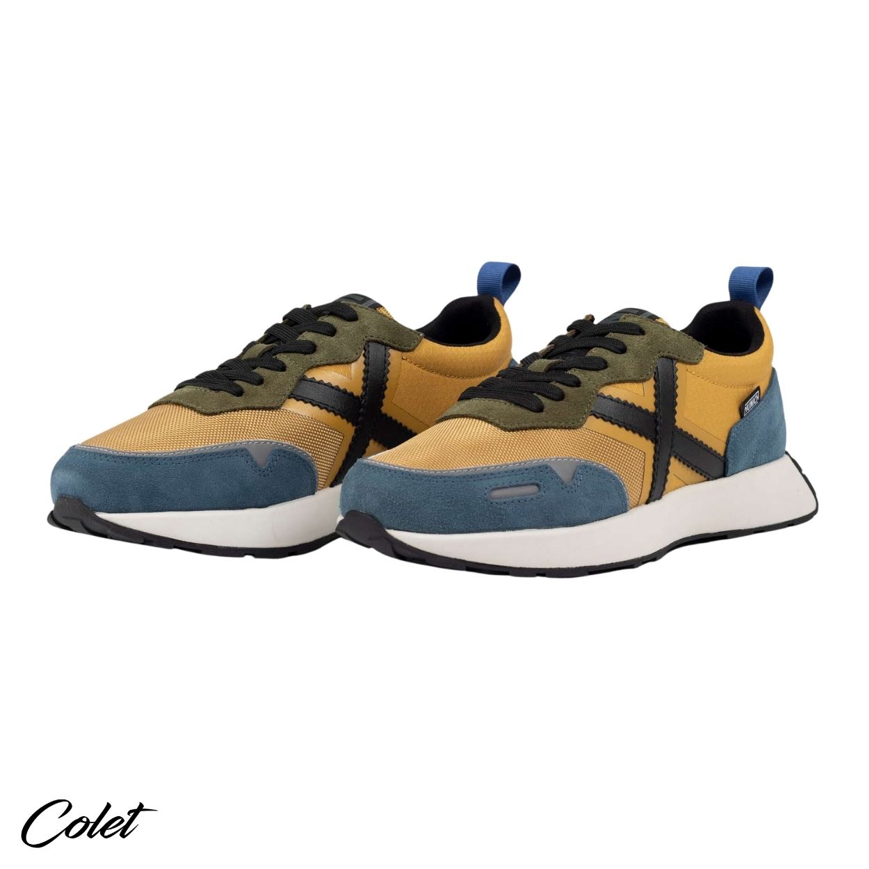 Zapatillas mostazas con detalles en azul.
