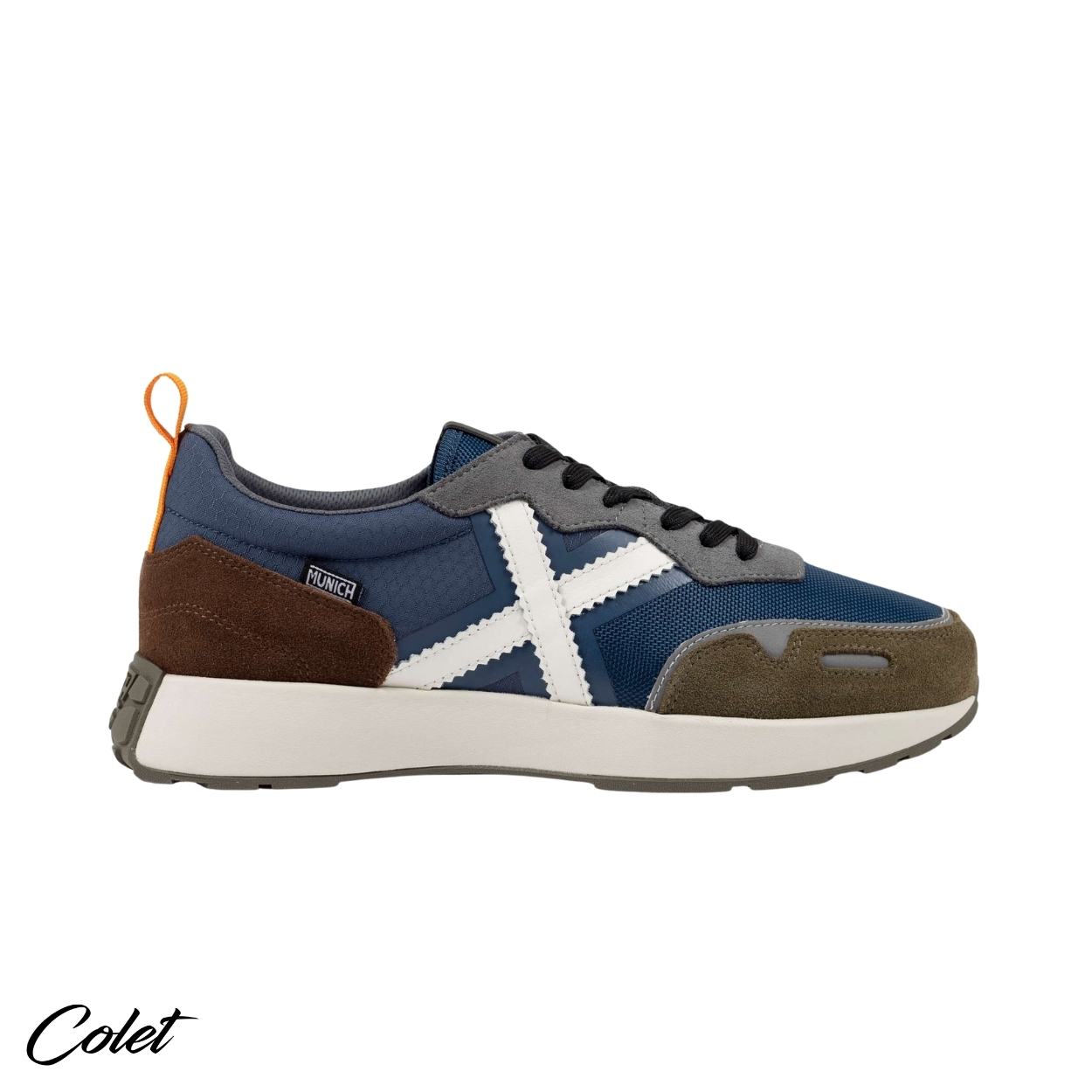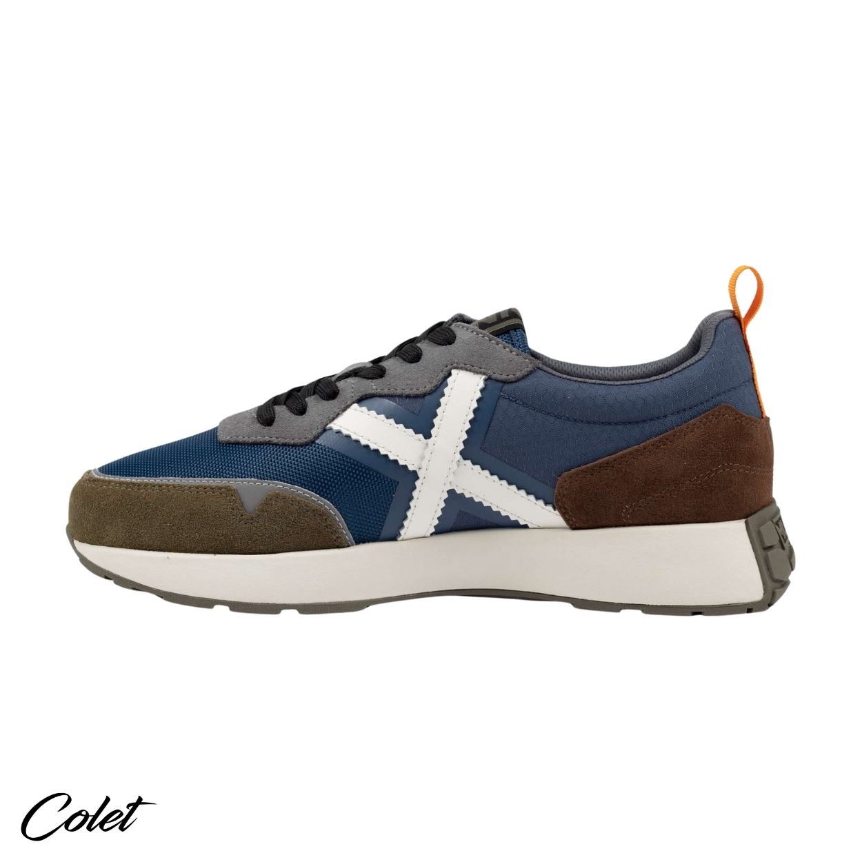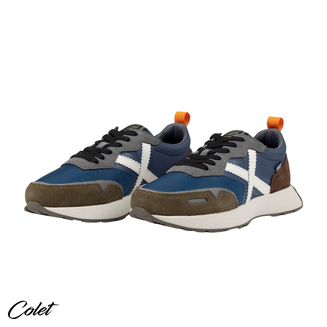 Zapatillas azules con detalles en marrón.