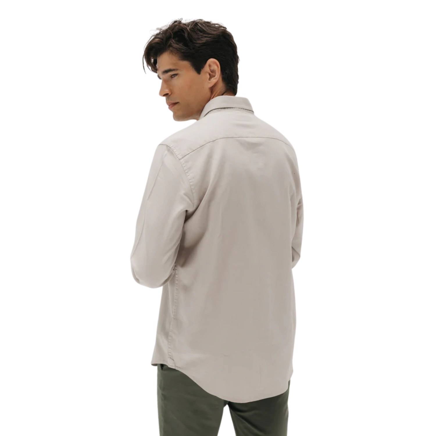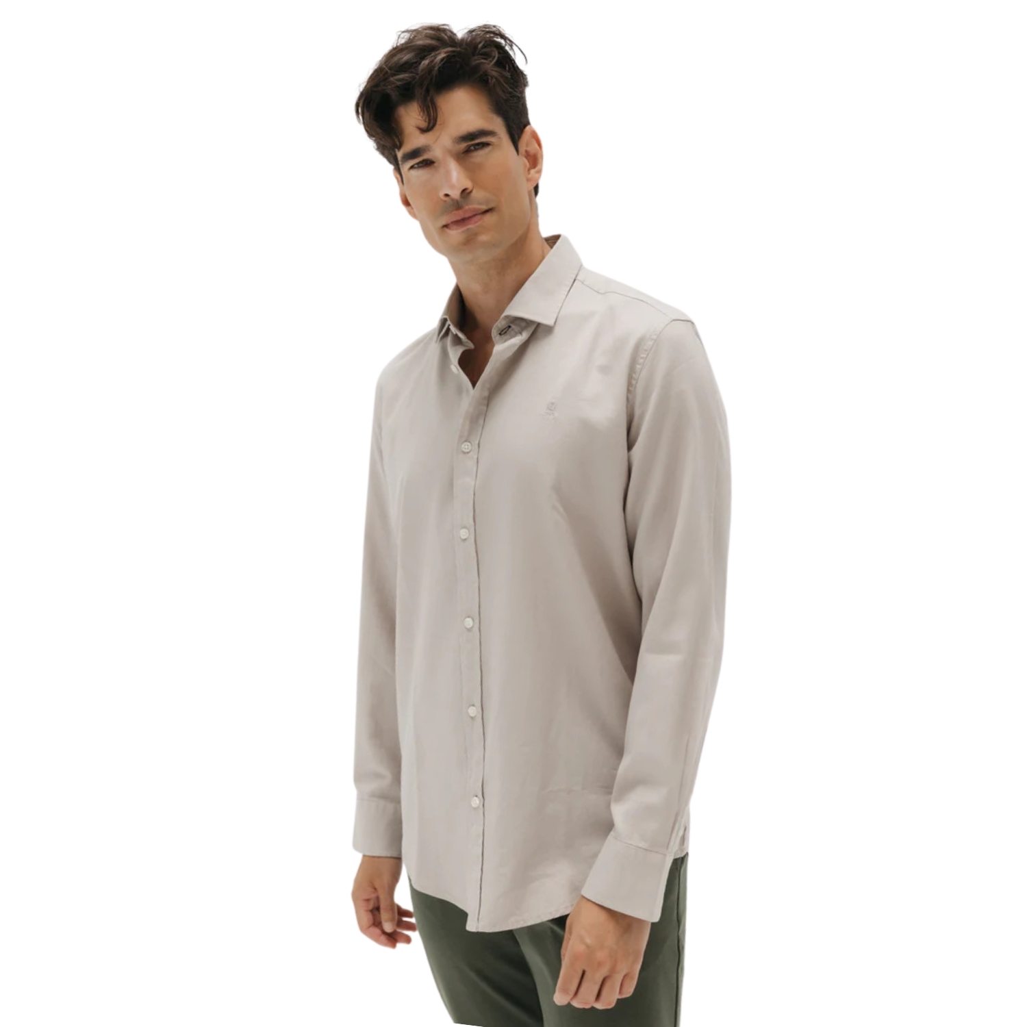 Camisa casual de hombre confeccionada en 100 % algodón, con estructura garment dyed en color arena, que le aporta un acabado único y un tacto suave. Incorpora cuello italiano y un logo bordado a tono en el pecho, discreto y elegante.