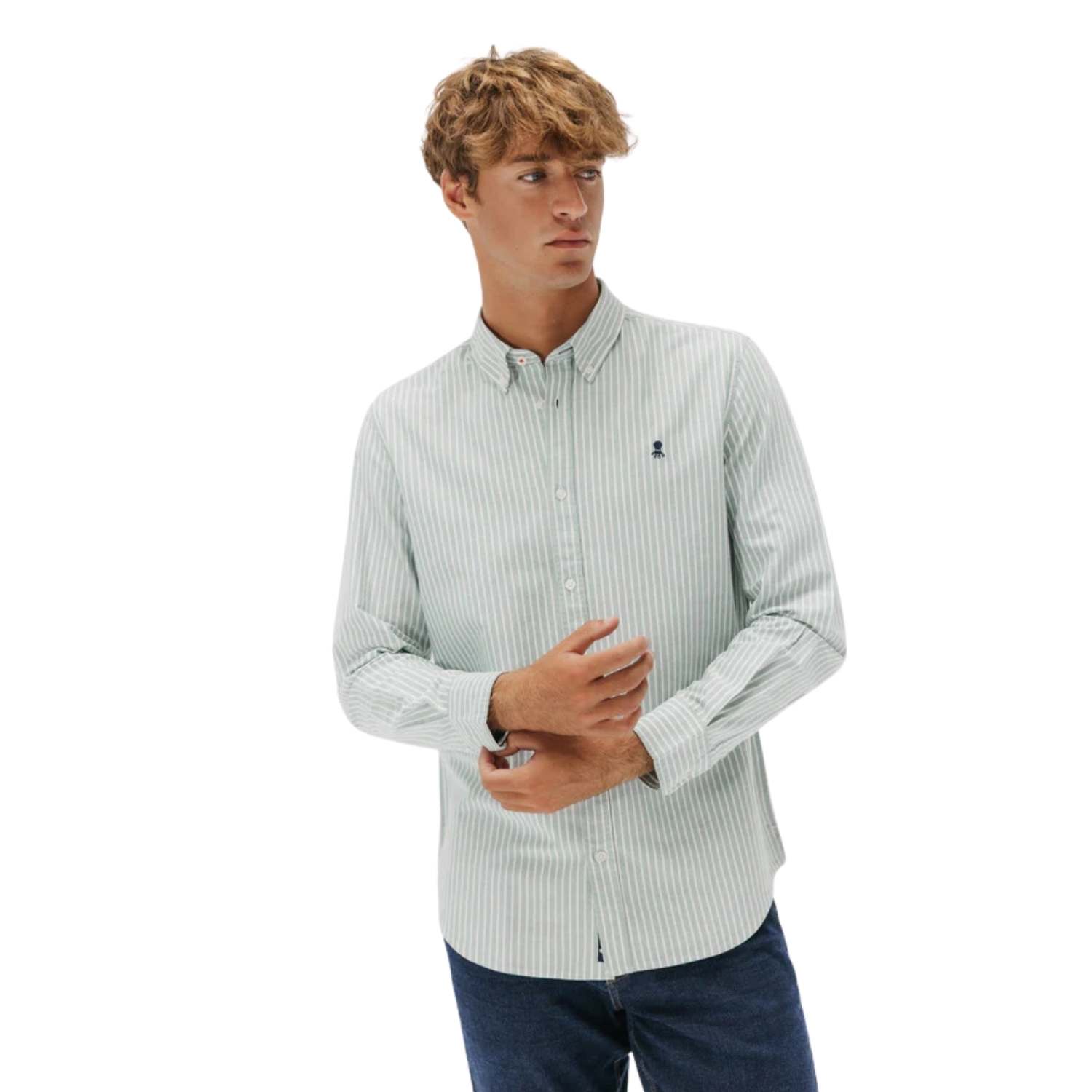 Camisa de vestir Oxford de rayas verdes, confeccionada en 100 % algodón de alta calidad. Presenta cuello con botones y un logo bordado a contraste en el pecho, que aporta un toque distintivo y elegante.