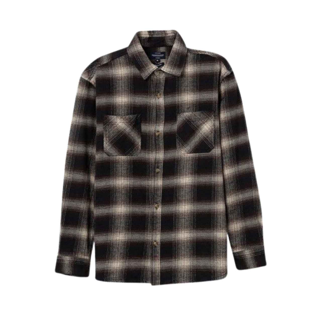 Sobrecamisa oversized de franela de algodón a cuadros, dos bolsillos de parche en la parte delantera y cierre de botones. Cuello camisero, manga larga con botones en los puños.