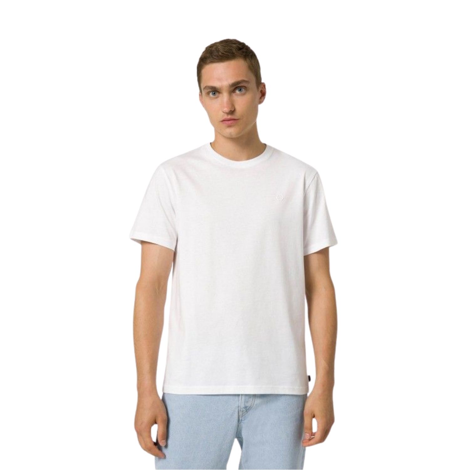 Camiseta blanca regular fit de cuello redondo y manga corta. Cuello en rib. Detalle estampado delantero con relieve.
