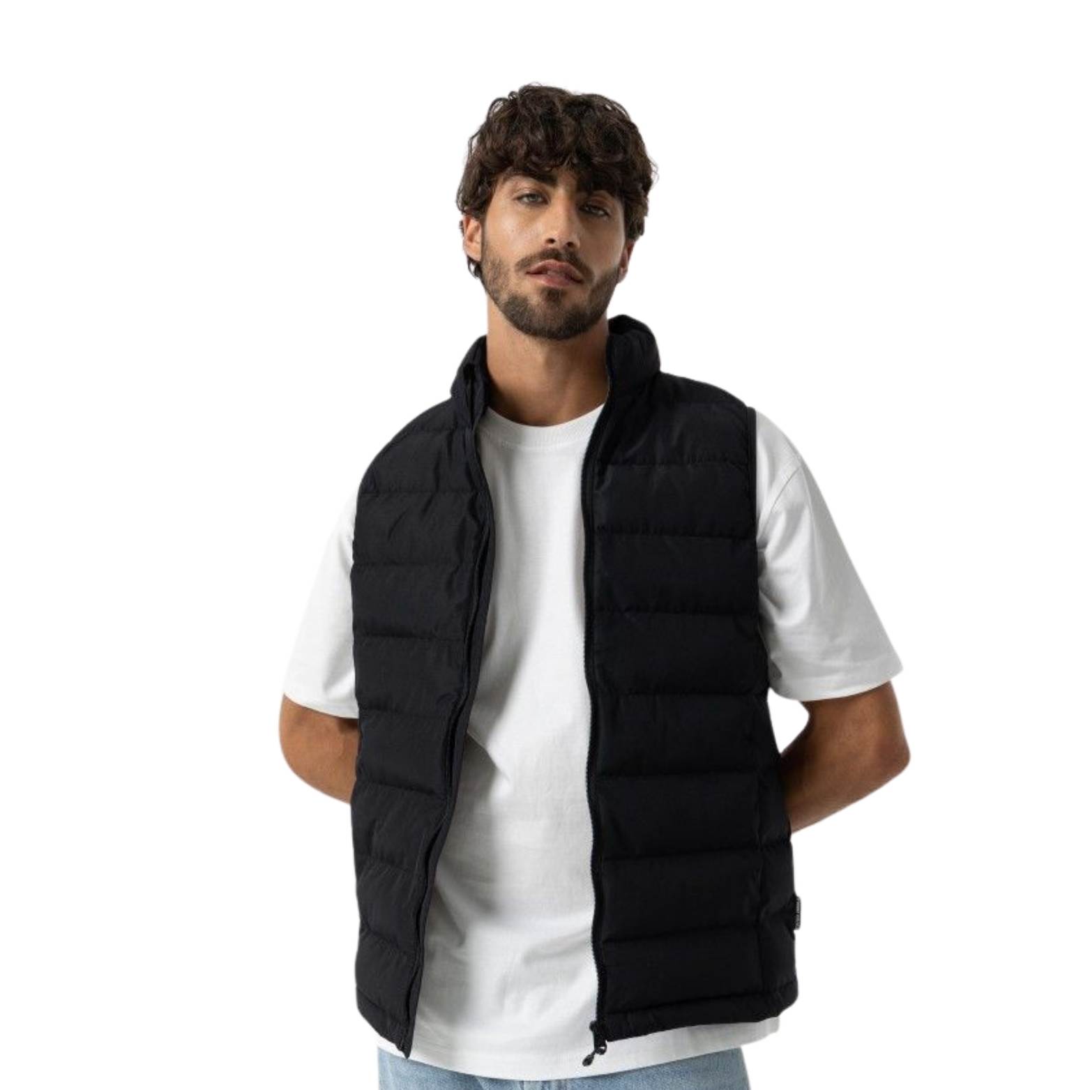 Chaleco negro acolchado para hombre. Chaleco con cuello subido y sin mangas. Bolsillos laterales. Cierre de cremallera frontal. Bolsillo interior.