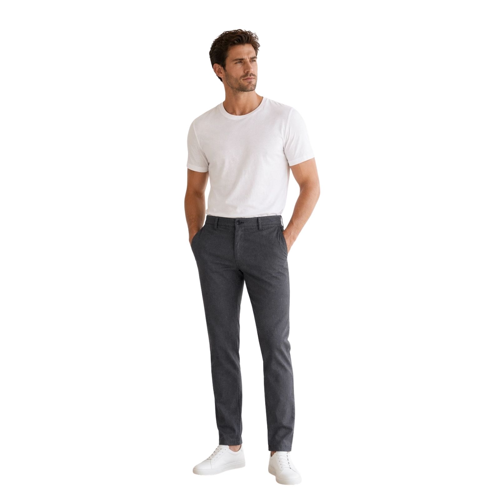 Elegancia contemporánea y confort excepcional. Este pantalón ha sido diseñado para el hombre moderno que busca un equilibrio perfecto entre un estilo impecable y la libertad de movimiento. Su tejido jaspeado aporta una profundidad visual única, ideal para destacar con sutileza en cualquier ocasión.