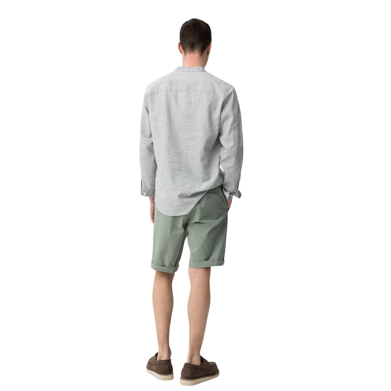 Bermuda para hombre de corte slim en color verde suave, ideal para un estilo fresco y actual. Confeccionada en algodón con elastano que proporciona comodidad y libertad de movimiento, cuenta con bolsillos laterales funcionales y bajo con vuelta que añade un toque moderno. Perfecta para looks casuales de verano y combinaciones versátiles para el día a día.