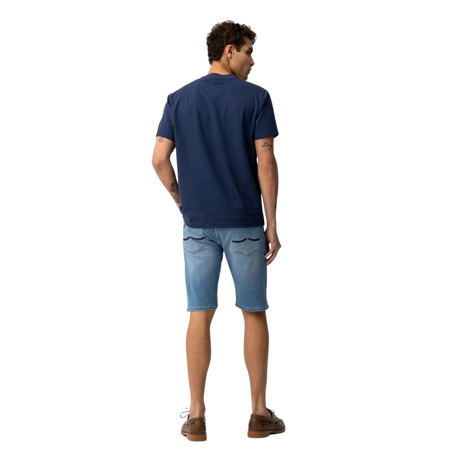 Bermuda de hombre de corte slim fit en color azul medio, diseñada para ofrecer un ajuste moderno y favorecedor. Su estilo versátil incorpora bolsillos laterales y traseros clásicos, ideal para looks casuales o de verano.