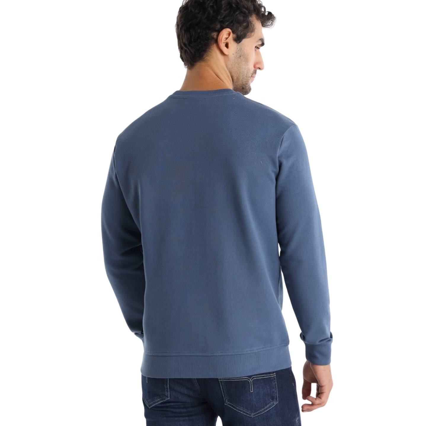 Sudadera azul con logo de marca al frente.