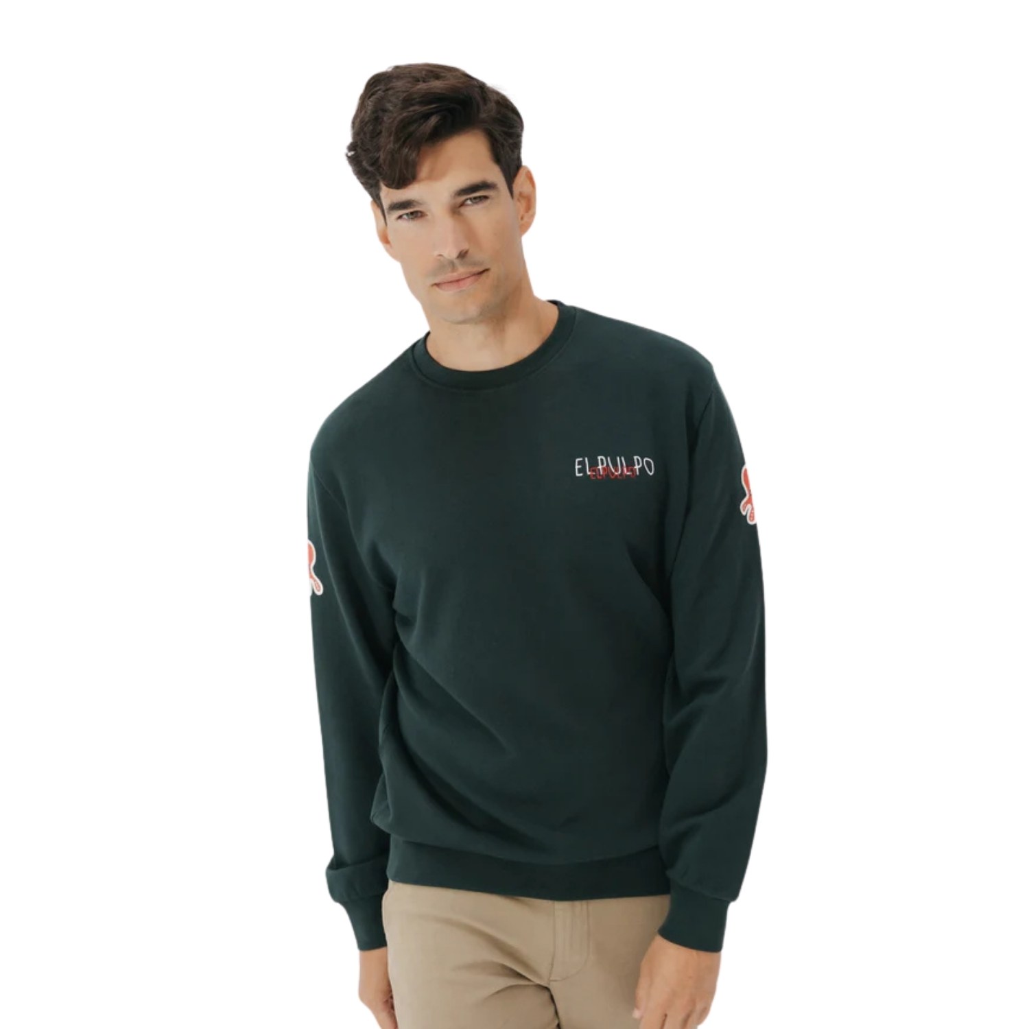 Sudadera triple logo confeccionada en 100% algodón orgánico en color verde botella. Print elPulpo en pecho, mangas y espalda a contraste en rojo. Regular fit y cuello redondo.