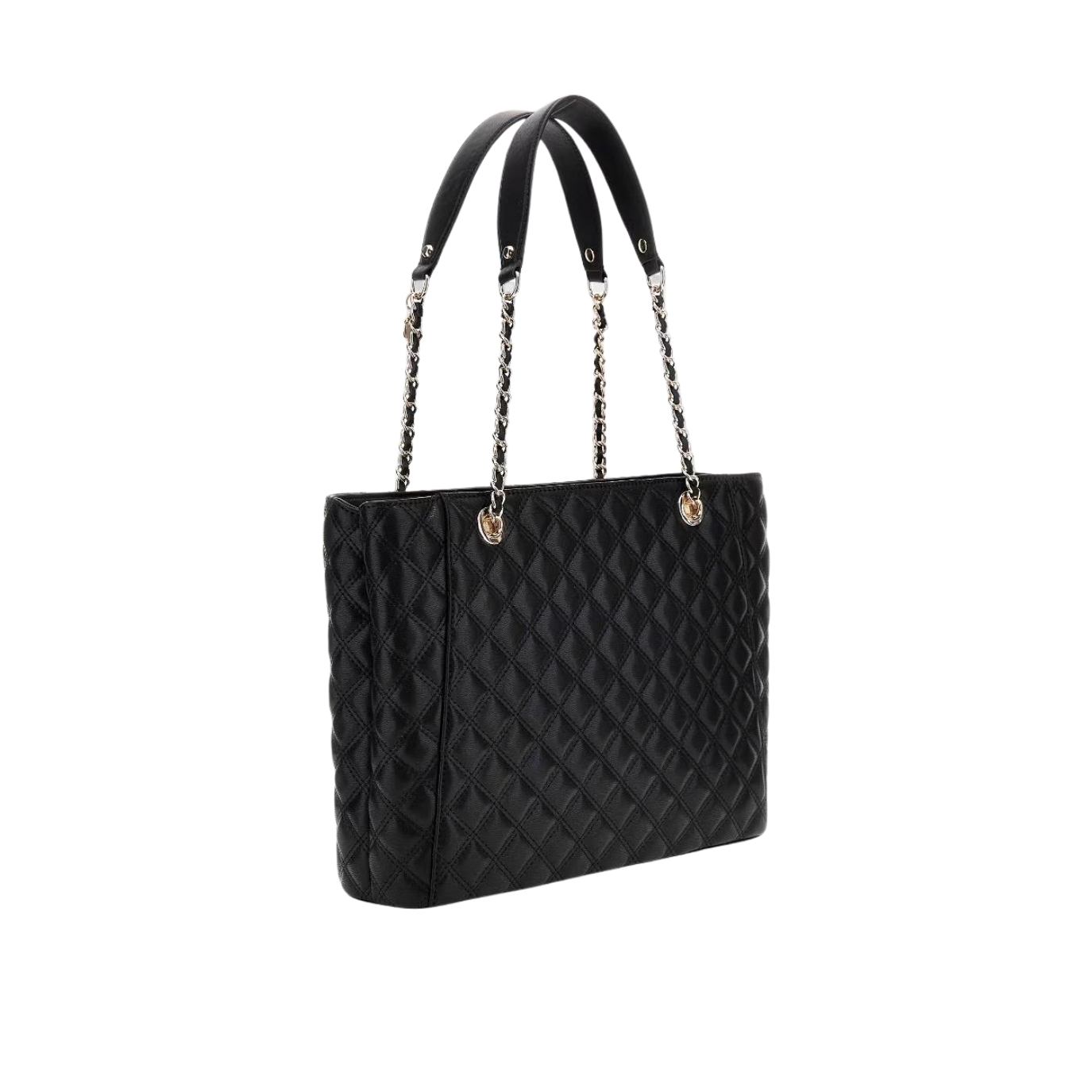 Bolso de hombro tipo tote modelo Giully II de terminación acolchada, cierre de cremallera, doble asa de cadena y logotipo triángulo metálico central en tono dorado.
