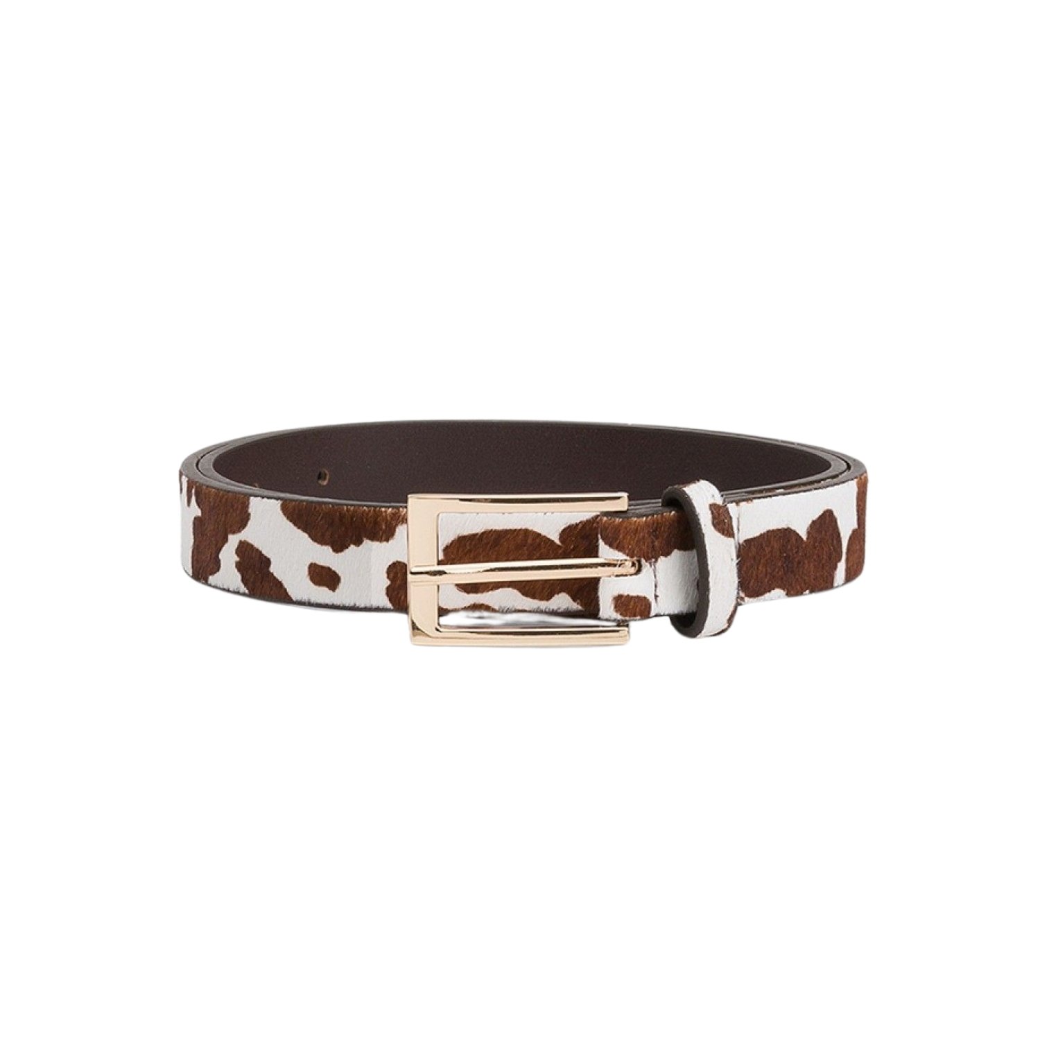 Cinturón de piel auténtica con estampado animal en tonos marrón y blanco, ideal para aportar un toque sofisticado y moderno a cualquier look. Confeccionado en 100% Genuine Leather, garantiza calidad, resistencia y durabilidad. Incorpora una hebilla metálica dorada de acabado elegante que realza su diseño y lo convierte en un accesorio versátil, perfecto tanto para estilos casuales como más refinados.