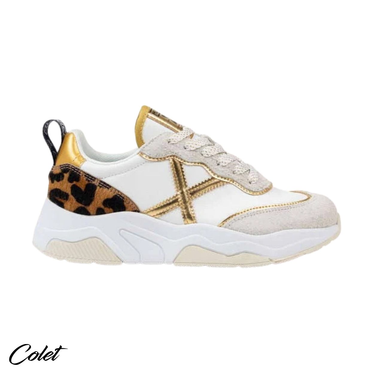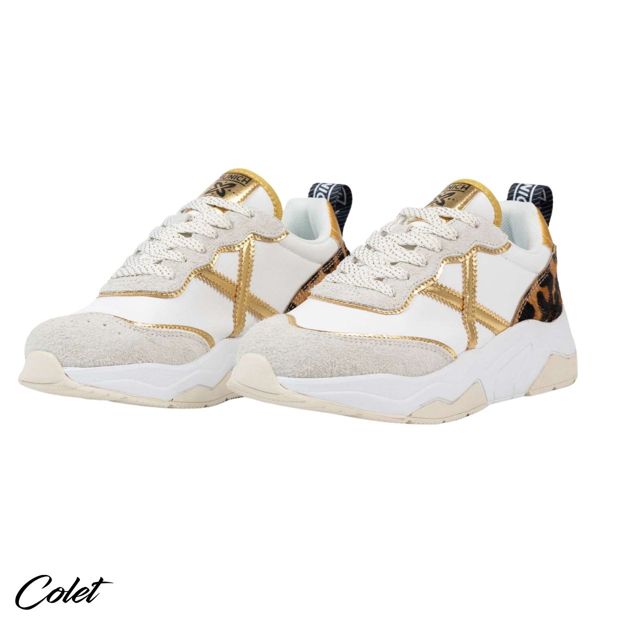 Zapatillas blancas con detalles en oro.