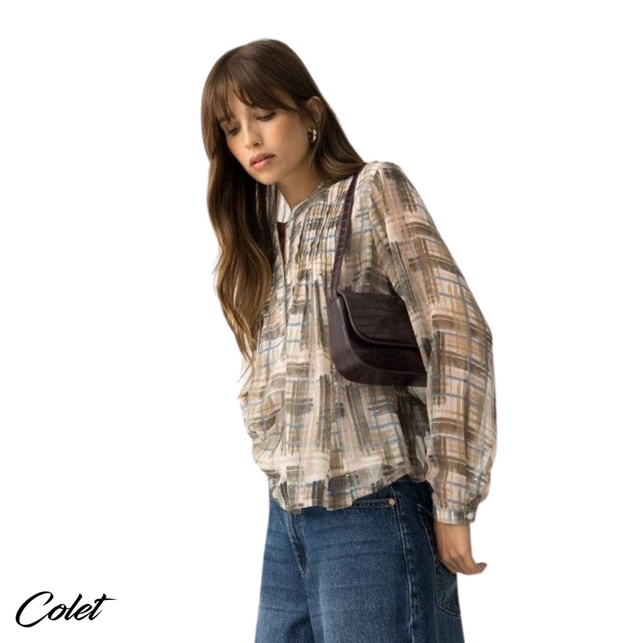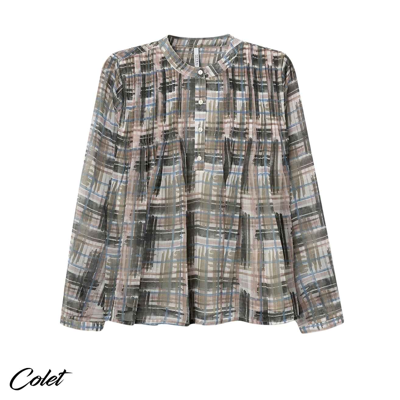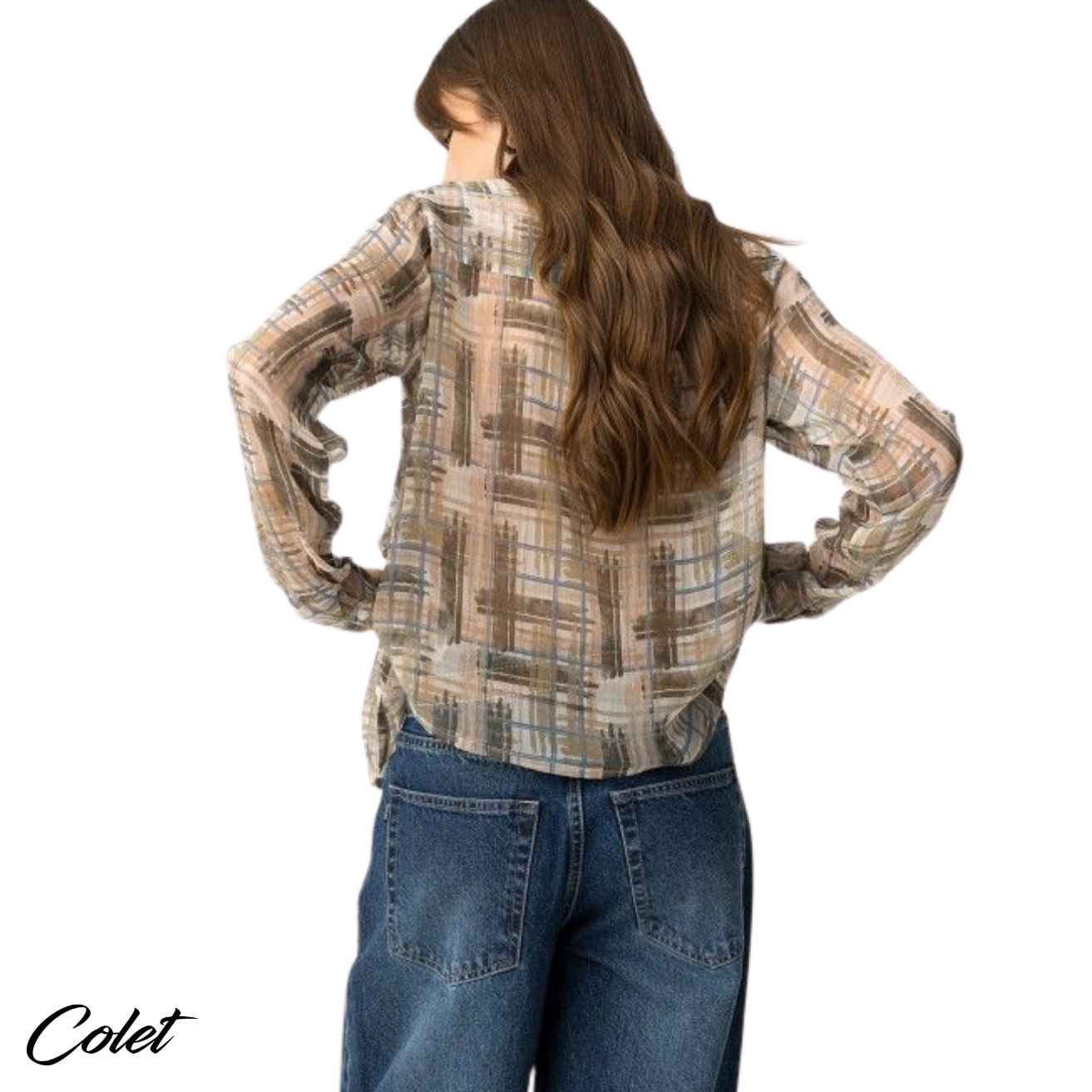 Blusa fluida estampada, con escote redondo, cierre frontal de botón y manga larga.