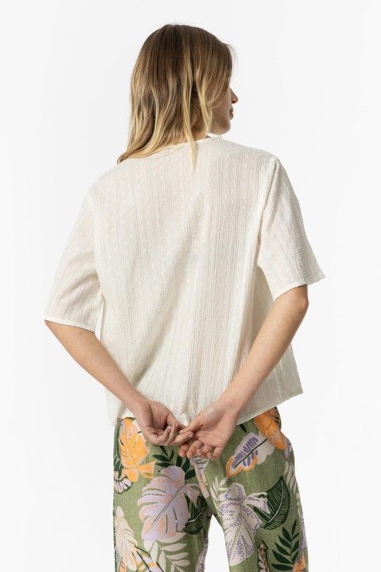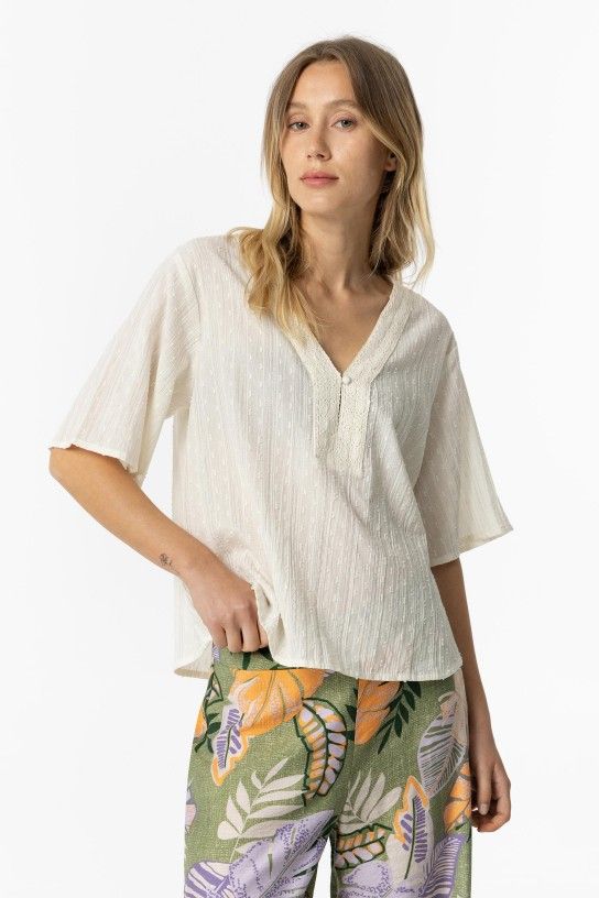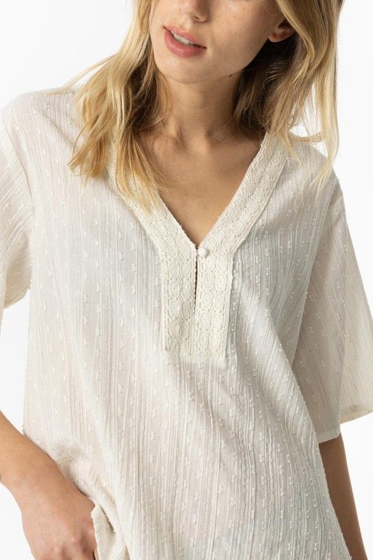 Blusa de escote pico con detalle de encaje y manga corta. Aplicación hilo metalizado combinado a contraste.