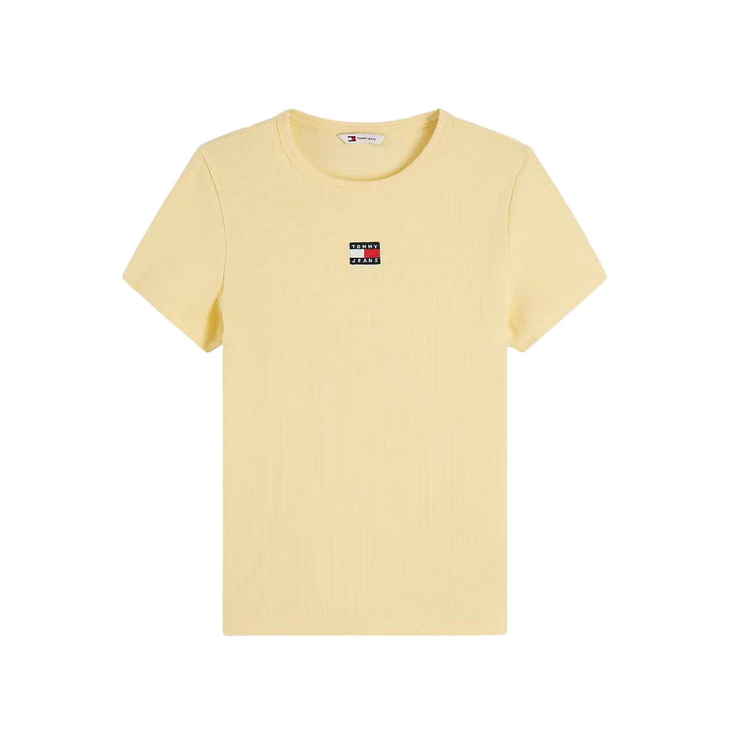 Descubre la Camiseta Tommy Jeans Slim Badge Rib Pearly en color amarillo, una prenda femenina y versátil que combina estilo y comodidad. Confeccionada en tejido acanalado de alta calidad, ofrece un corte slim fit que se adapta a la silueta realzando la figura sin renunciar al confort.