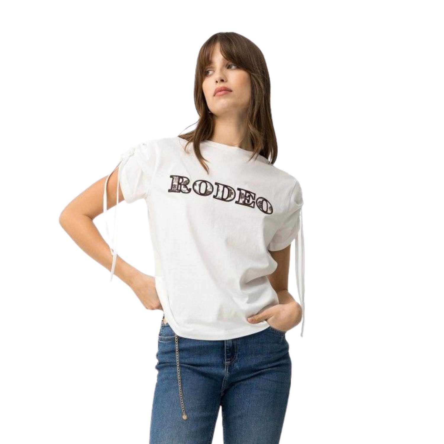 Esta camiseta blanca de cuello redondo para mujer destaca por su diseño sencillo con un detalle original. Confeccionada en algodón, ofrece un tacto suave y cómodo, ideal para el uso diario. Los detalles de cordeles en las mangas aportan un toque moderno y distintivo, convirtiendo esta prenda básica en una opción versátil y actual para looks casuales.