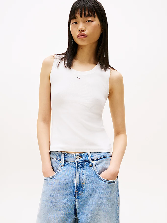 Esta camiseta sin mangas, un básico para los días de calor, luce un corte slim y una textura acanalada.