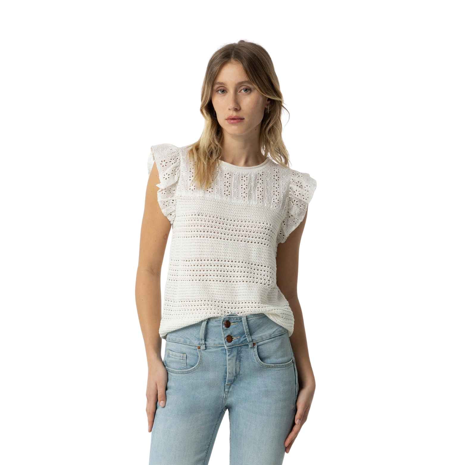Top de punto combinado con cuello redondo y manga sisa con detalle de volante, una prenda que une comodidad y estilo con un toque femenino.