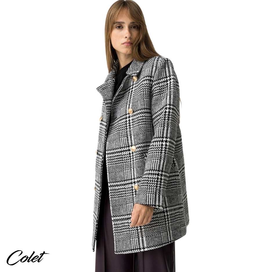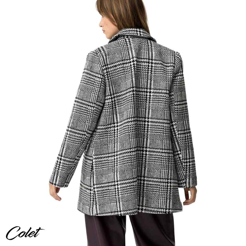 Abrigo largo slim fit de tweed, con solapado doble y botones metálicos. Solapa con cuello, dos bolsillos con solapa frontales y manga larga.