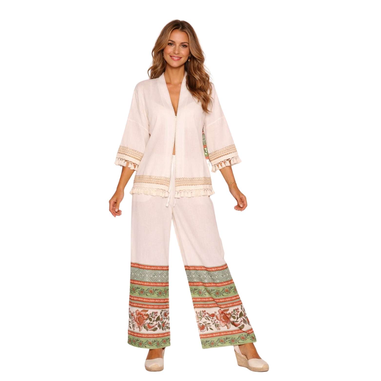 Su diseño abierto y fluido se adapta a todo tipo de siluetas, mientras que los detalles bordados y los flecos en mangas y bajo le aportan un aire bohemio y elegante. Una prenda imprescindible para looks casuales, de vacaciones o incluso para ocasiones más especiales.