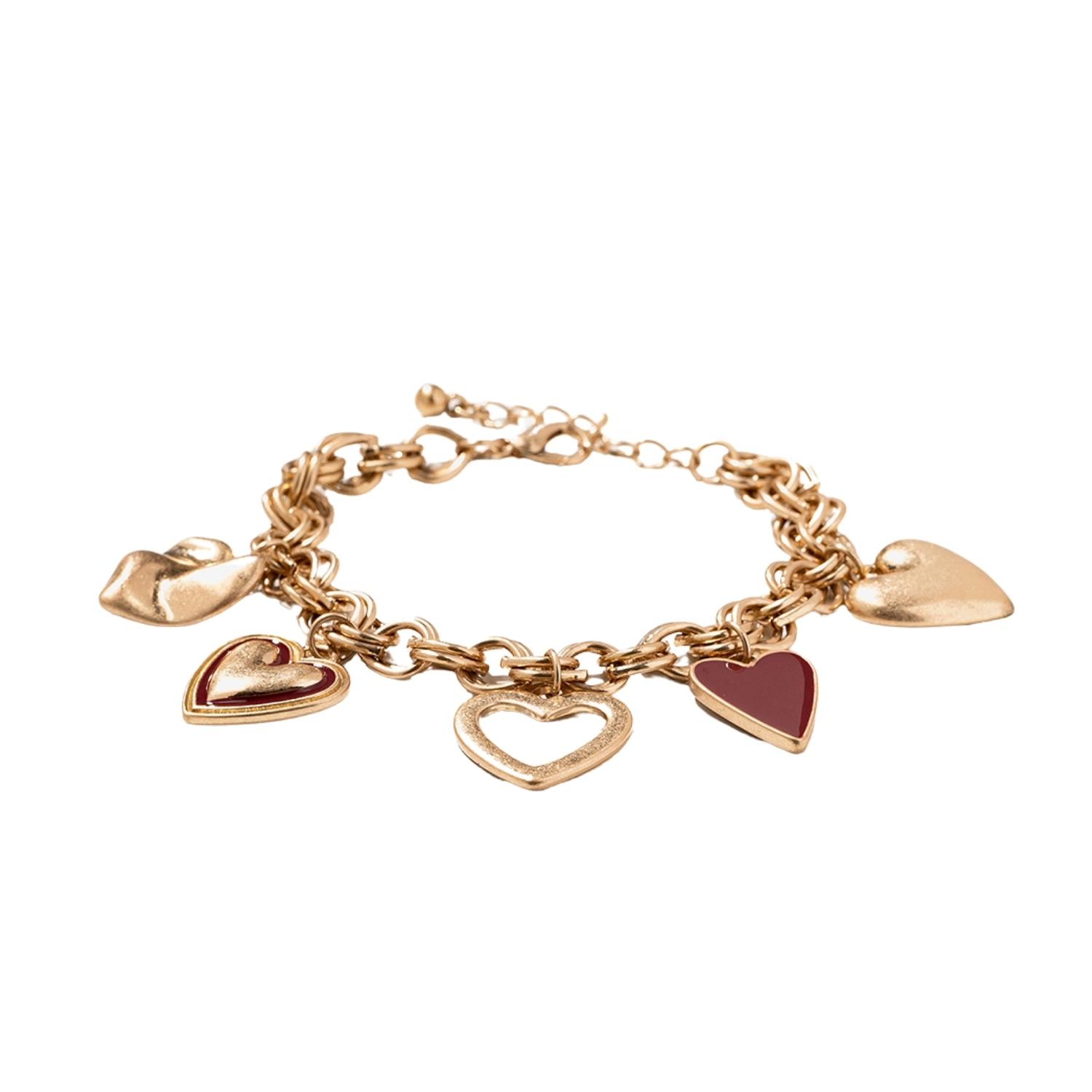 Pulsera de corazones dorados con detalles en granate.