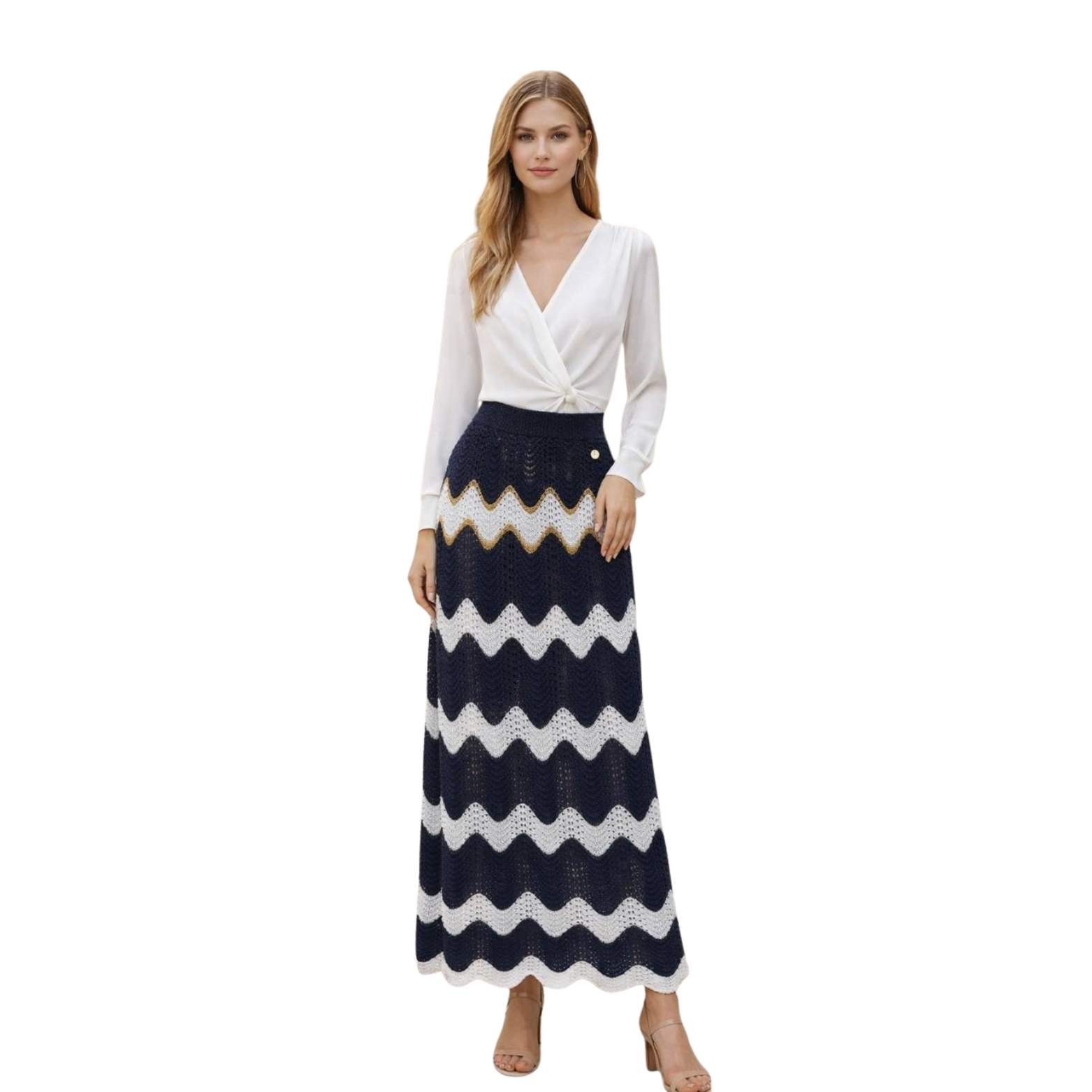 Falda larga de punto calado para mujer en marino y blanco – diseño de ondas y detalle dorado