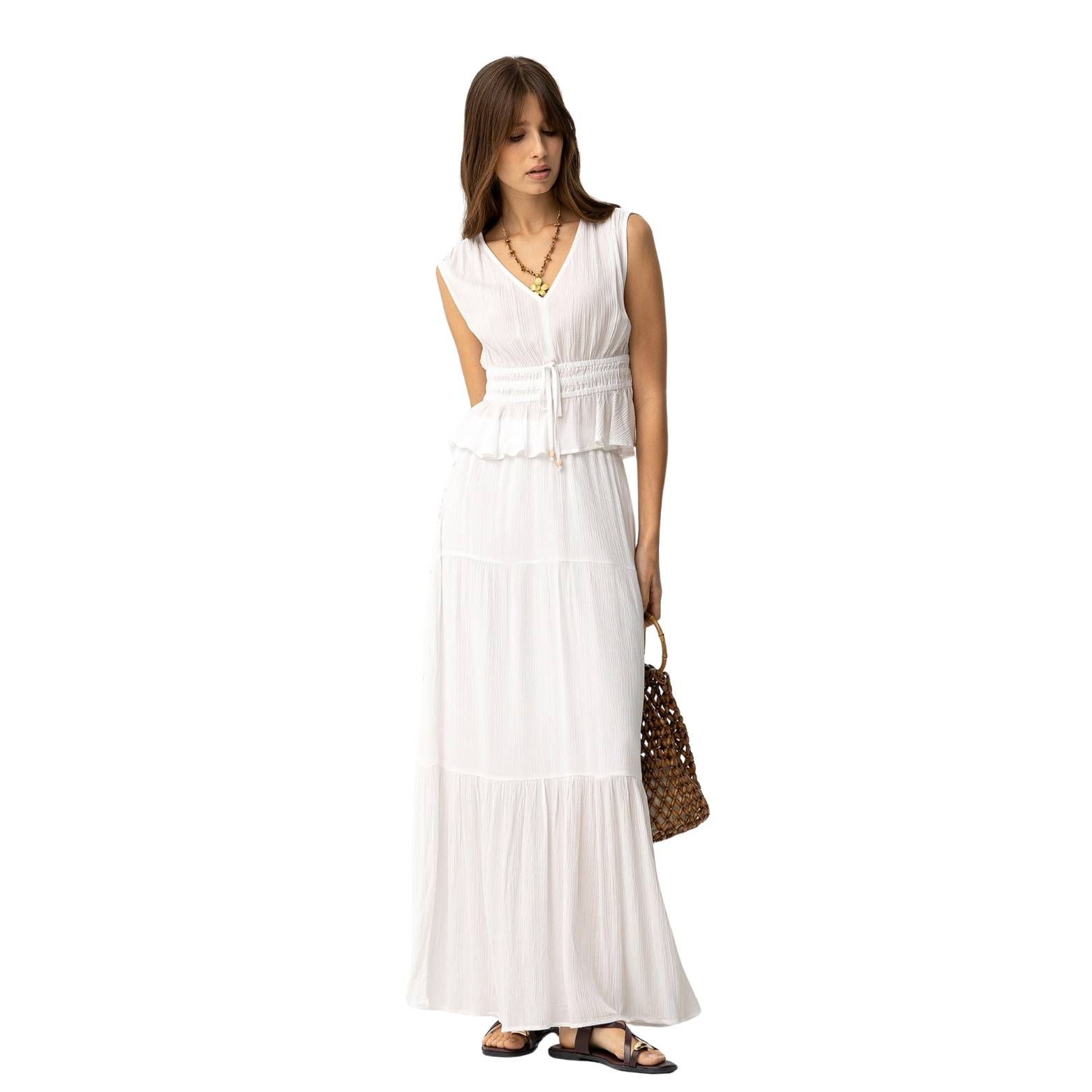 Falda larga para mujer en color blanco de corte regular, ideal para un estilo fresco y femenino. Confeccionada en 100% viscosa, ofrece una caída ligera y fluida perfecta para los días cálidos. Incorpora cintura elástica para mayor comodidad y volantes fruncidos en capas visibles que aportan movimiento y un toque romántico. Una prenda versátil, perfecta para looks de verano tanto casuales como más arreglados.