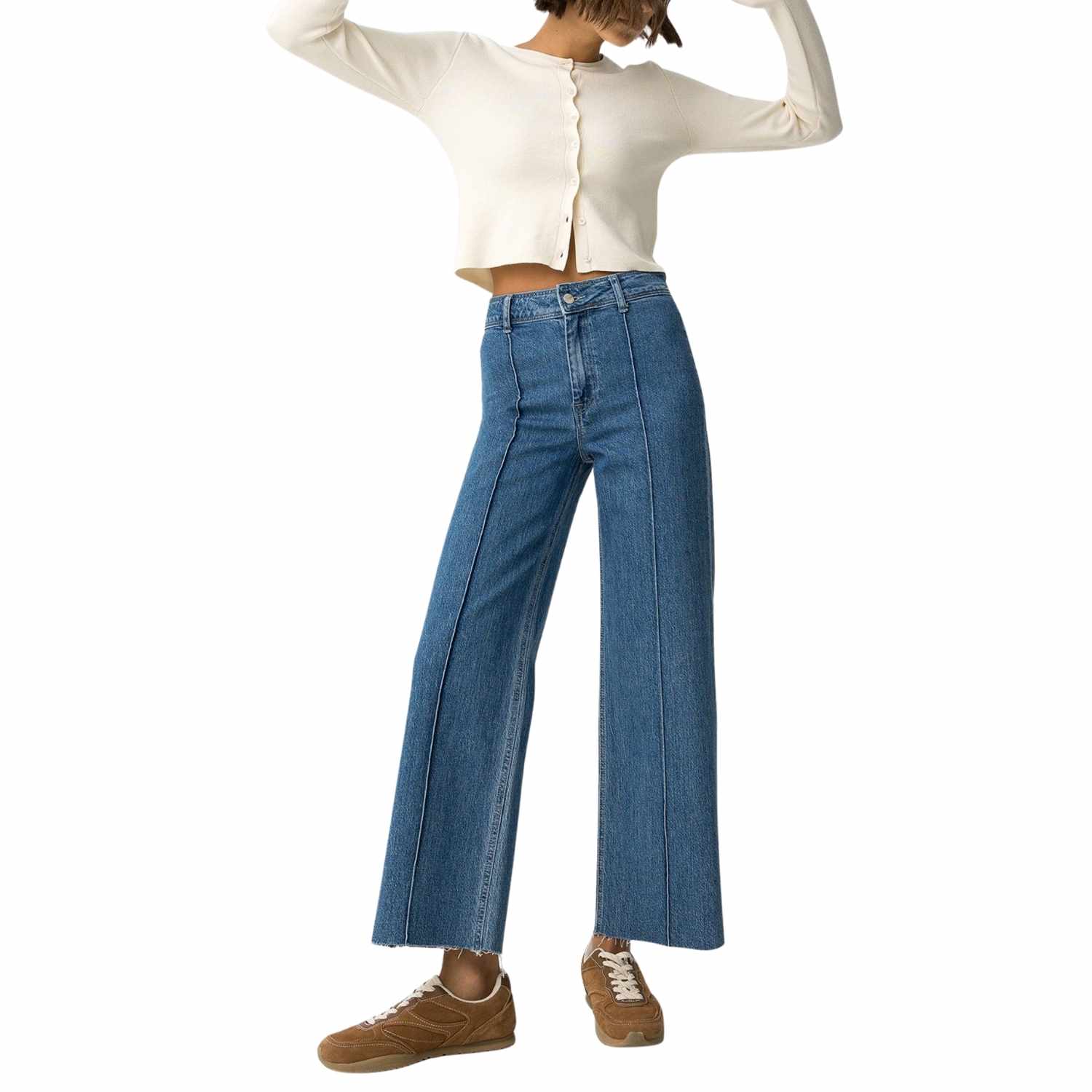 Jeans anchos de talle bajo y cinco bolsillos. Cierre frontal con cremallera y botón metálico. Dobladillo deshilachado.