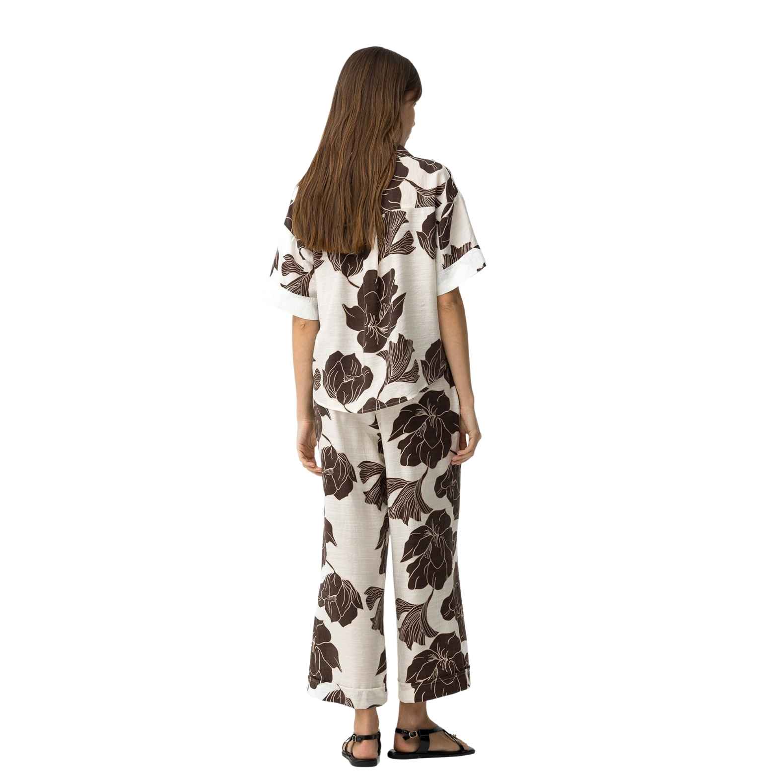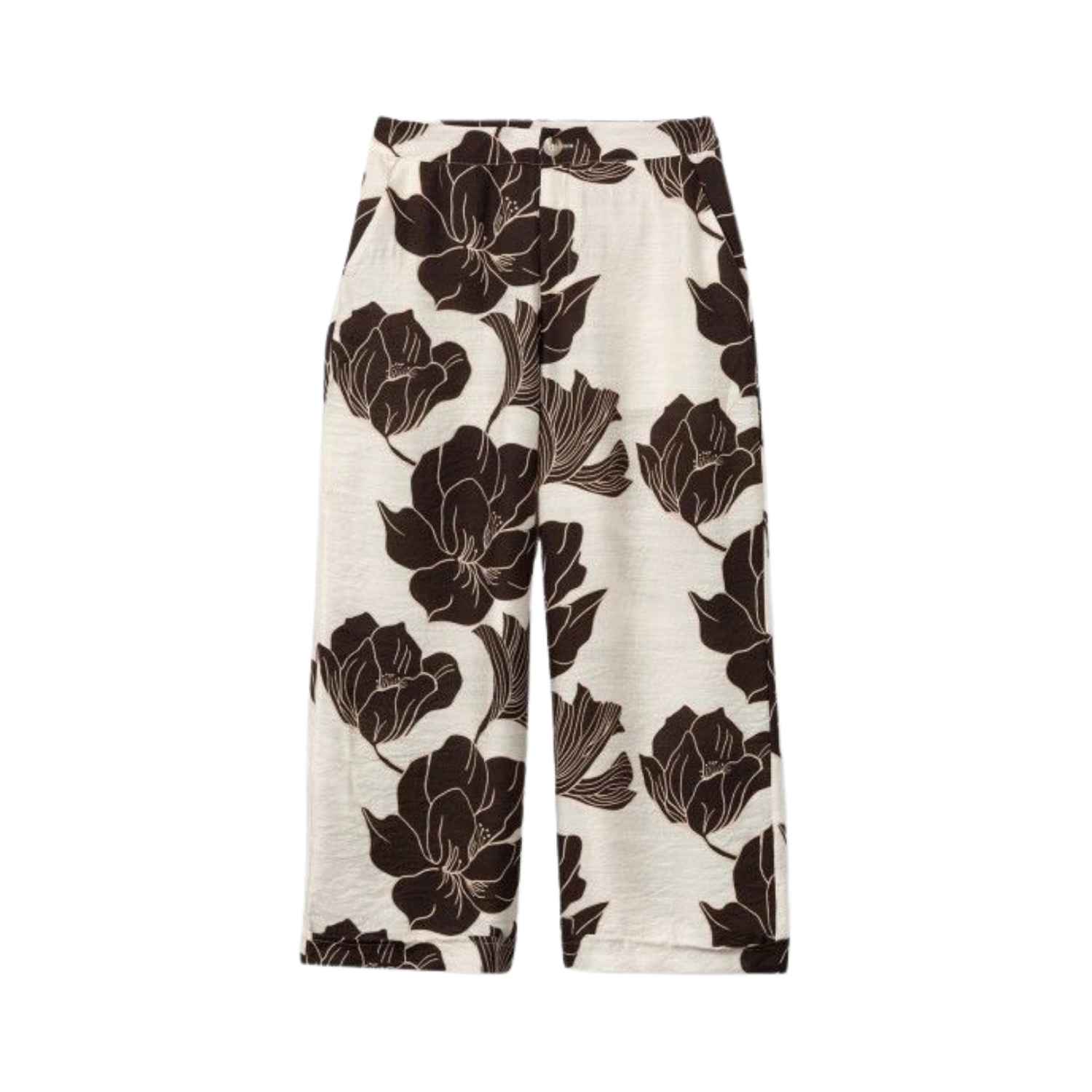 Pantalón estampado palazzo para mujer, de corte flojo y caída fluida, ideal para un look cómodo y elegante. Confeccionado en 80% viscosa y 20% poliamida, ofrece ligereza y suavidad al tacto. Presenta un estampado floral en tonos marrones sobre fondo beige, perfecto para aportar estilo y frescura a cualquier conjunto. Una prenda versátil, ideal para el día a día o para ocasiones especiales con un toque sofisticado.
