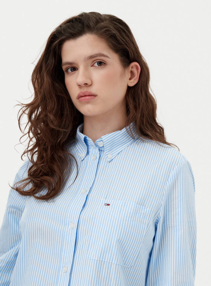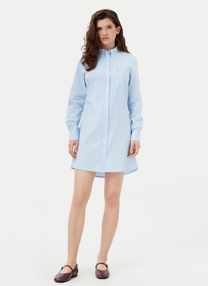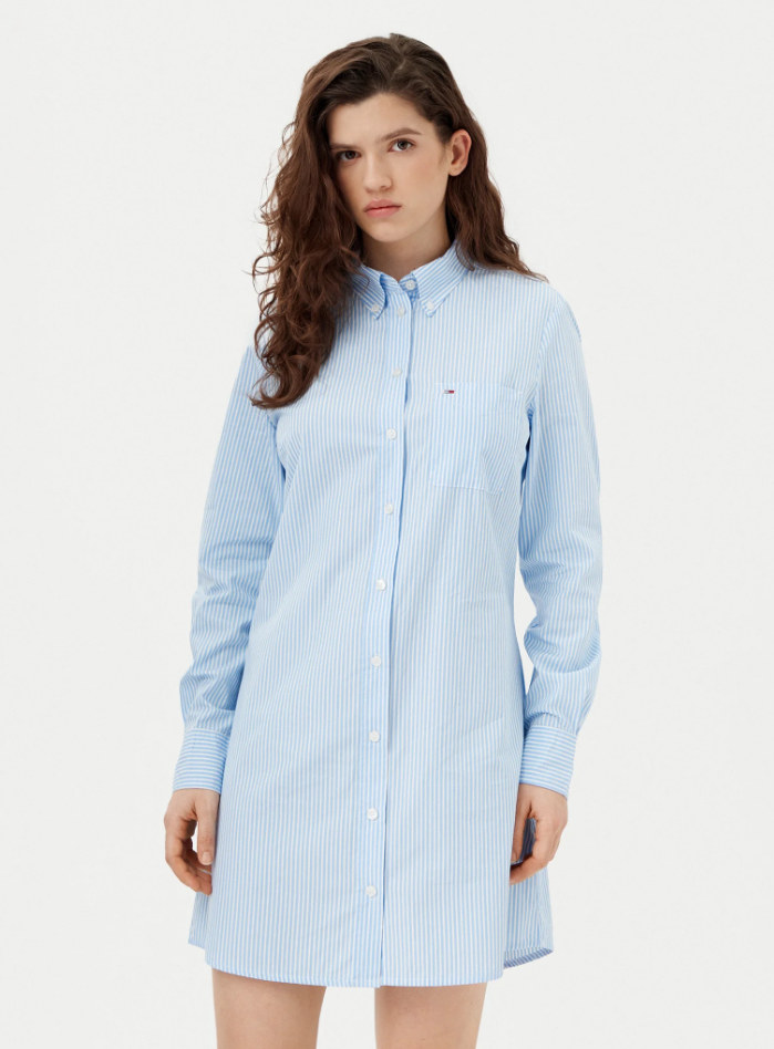 Vestido camisero azul con rayas en color blanco.