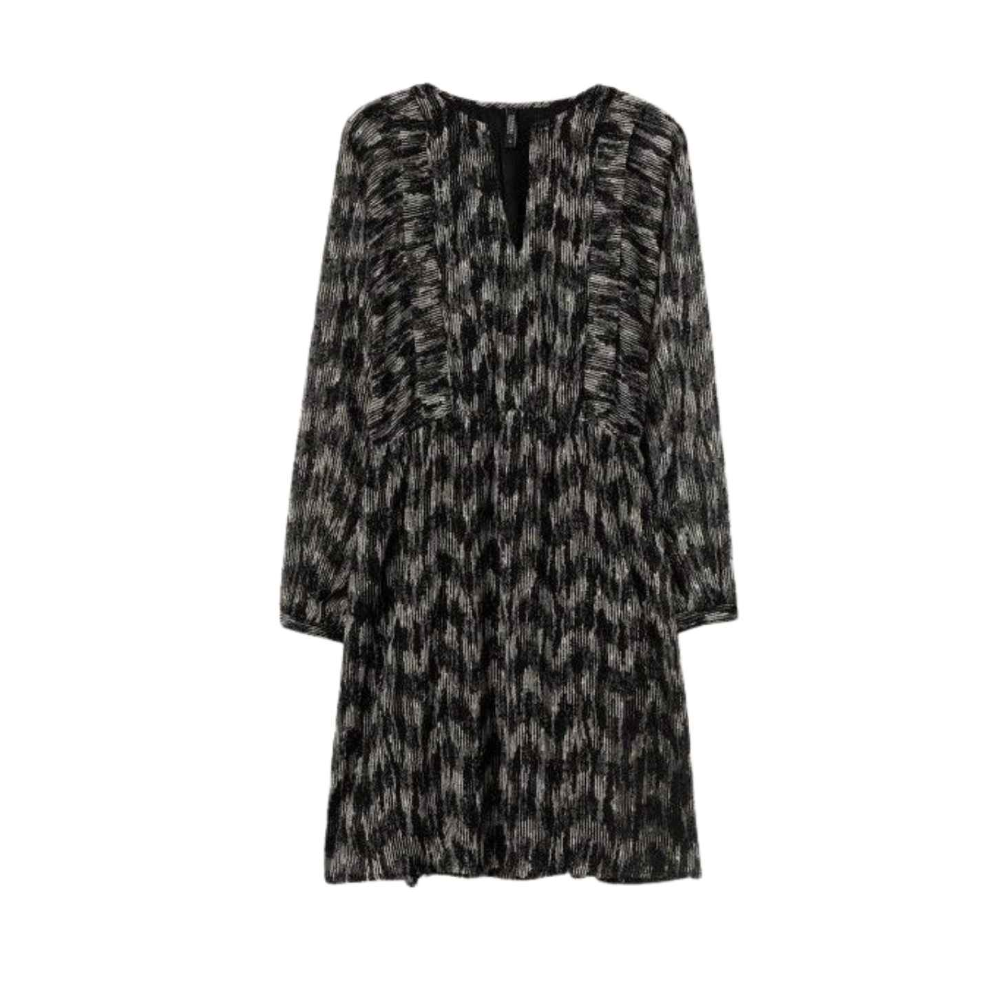 Vestido negro con detalles en color blanco. Vestido con escote pico y manga larga con botón. Elástico en la cintura. Estampado all over.